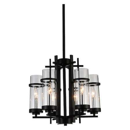 Create the right ambiance for a fabulous meal with family and friends by replacing your light fixture with this Sierra 6 Light Chandelier. Six candelabra bulbs encased in clear cylindrical glass will provide your dining area with a warm, inviting glow. Install a dimmer switch, too, and be able to adjust the brightness and the mood.Lighting is jewelry for the home, and there is the perfect piece for every room. This fixture is done in a beautiful black finish which could be the missing piece to lighten up and fall in love with your space all over again.<br/><br/>Features :<br/><br/>- Feel confident with your purchase and rest assured. This fixture comes with a one year warranty against manufacturers defects to give you piece of mind that your product will be in perfect condition.<br/>- Dimensions: H 17" x W 18" x L 18"<br/>- Black Finish - E12 Bulb Not Included - Indoor (Dry Location)<br/>- cETLus Approved<br/>- Includes Assembly Instructions and Hardware<br/>- Compatible With Standard Low Voltage Dimmer.<br/><br/>Specifications :<br/><br/>- Number of Lights : 6<br/>- Voltage : 120v<br/>- Bulb Type : E12<br/>- Warranty Description : One year warranty against manufacturers defect<br/>- Installation Type : Hardwired<br/>- Material : Metal.