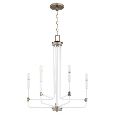 QUORUM 633-5-0881 5-Light Chandelier, Studio White w/ Dark Brass. Product Style: Transitional. Finish: Studio White w/ Dark Brass. Dimension(in): 27.5(H) x 21(W). Bulb: (5)60W CandelabraBase(Not Included). UL Type: Damp.
