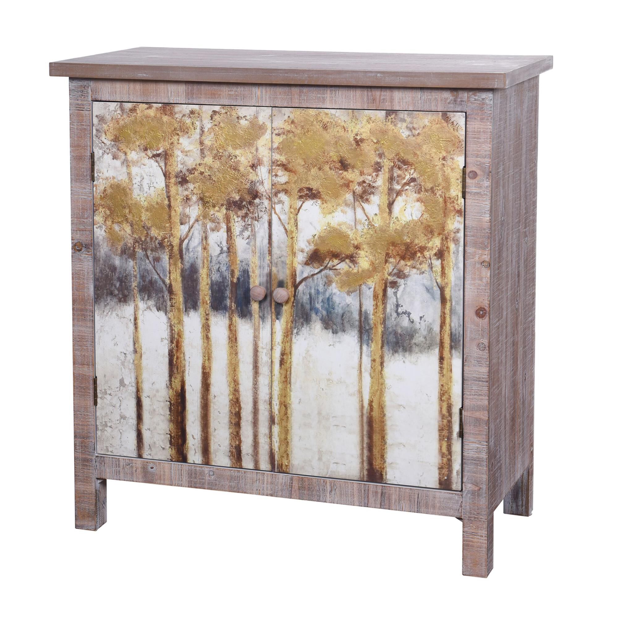 Two Door Cabinet Made Of Fir WoodFeaturesDue To The Production Process, Each Piece Is Unique And No Two Are Exactly Alike.This fir wood cabinet has a natural finish and Earthy texture with its distressing and knots.The fron two doors have a hand painted fall birch scenery with gold leaf accents to make this a one of a kind piece. Material: Fir Wood, Paint Color: Natural, Painted Product Size: 16 x 32 x 34 Assembly Required: No Made In China