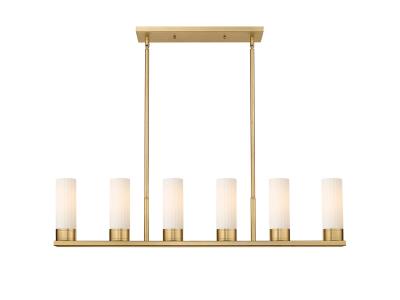 INNOVATIONS 429-6I-BB-G429-8WH Empire 6 44.25 inch Linear Pendant Brushed Brass. Style: Industrial, Modern Contempo, Restoration-Vintage. Collection Name: Downtown Urban. Metal Finish(Body): Brushed Brass. Material: Steel, Cast Brass, Glass. Dimension(in): 10.375(H) x 44.25(W) x 3.125(Ext). Bulb: (6)6W LED(Included). Stem Specs: 1-6 and 2-12 inch (5/8 diameter) stems. Voltage: 120. Dimmable: Yes. Color Temperature (Kelvin): 2700. Color Rendering Index (CRI): 90. Lumens: 750. Life Expectancy (Hours): 15000. Glass Shade Description: White Empire. Glass Type: Frosted. Shade Shape: Cylinder. Glass or Metal Shade Color: White. Shade Material: Glass. Shade Dimension(in): 3.125(W) x 7.875(H). Sloped Ceiling Compatible: Yes. California Proposition 65 Warning Required: Yes. UL/ETL Certification Type: Damp Location.