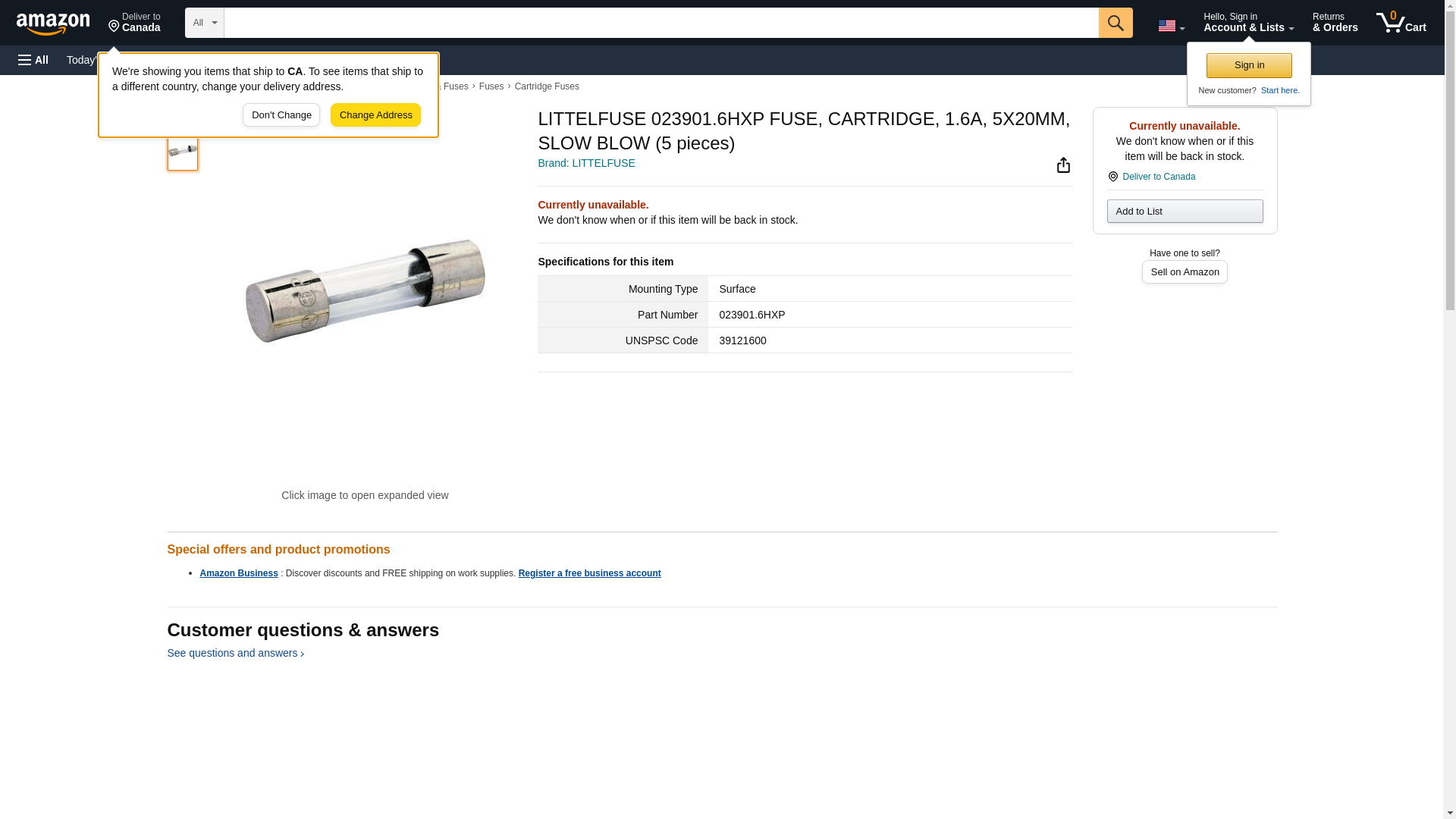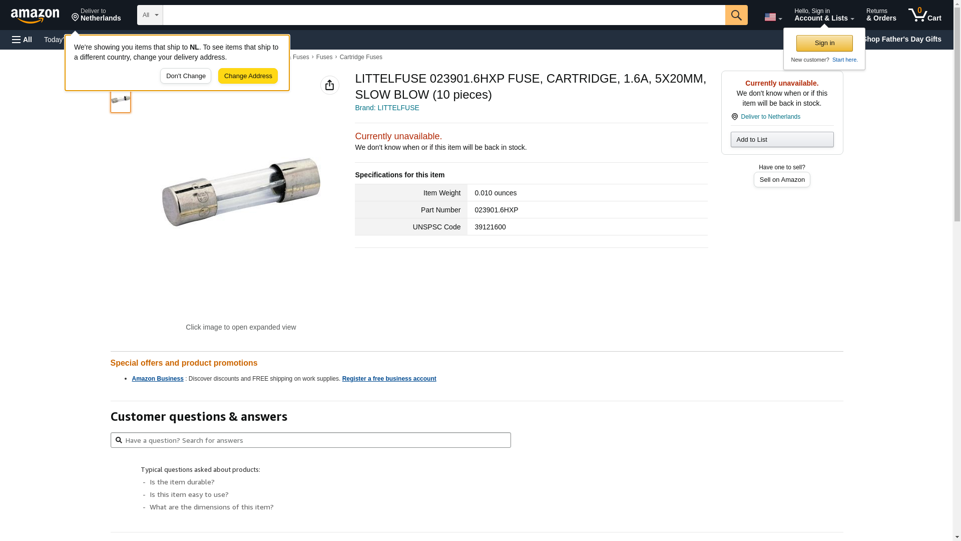 Product Description Littelfuse 023901.6HXP Fuse, Cartridge, 1.6A, 5X20mm, Slow Blow