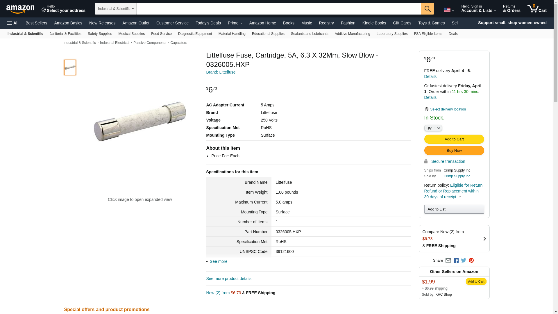 | Feature | LITTELFUSE 0326005.HXP FUSE, CARTRIDGE, 5A, 6.3 X 32MM, SLOW BLOW |