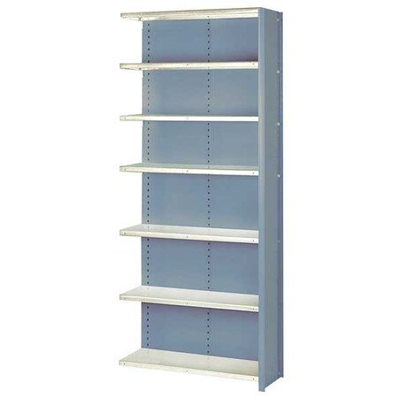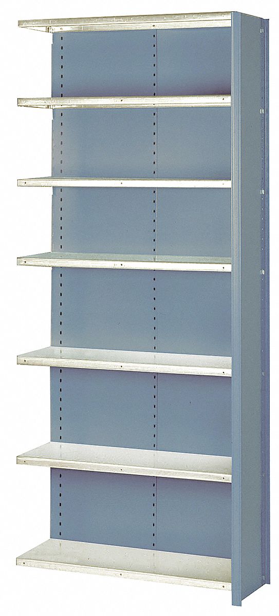 Metal Shelving Add-On Closed Material Steel Gauge 18 Number of Shelves 6 Width 36 In. Depth 12 In. Height 84 In. Shelf Capacity 625 lb. 1-1/2 in Increments Dove Gray Finish Galvanized Includes (7) Galnavized Shelves Closed Post Side Panel (28) Clips 2 Piece Back Panel