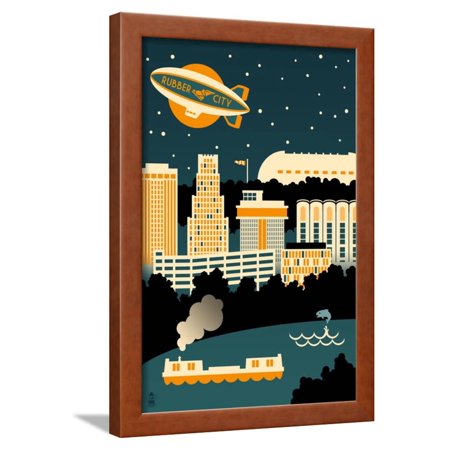 <ul> <li>Title: Akron, Ohio - Retro Skyline (no text)</li> <li>Artist: Lantern Press</li> <li>Paper Type: Art Print</li> <li>Product Type: Framed Art Print</li> <li>Framed in SOHO Pecan</li> <li>Arrives ready-to-hang for fast, simple installation</li> <li>Framed Size: 15.5x22 in.</li> <li>Handcrafted in the USA</li> </ul>