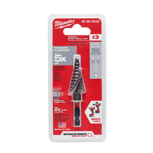 <ul></ul><p>The MILWAUKEE SHOCKWAVE Impact Duty #3 3/16 - 3/4" Step Bits are engineered to deliver the most durable and fastest impact step bit hole drilling solution. The step drill bits are made in the USA with global materials and deliver best-in-class performance in impact drivers with the versatility to be used in drills. The hex shank has an optimized SHOCKZONE body providing the industrys most durable shank, reducing early shank breaks. A Titanium Aluminum Nitride (TiAlN) coating delivers 5x longer life, while the step drill bit's Rapid Strike tip and dual spiral flute produce 2x faster holes. The 3/16 - 3/4" step bit features 10 steps with laser engraving for a clear stop on size identification.</p><ul></ul>