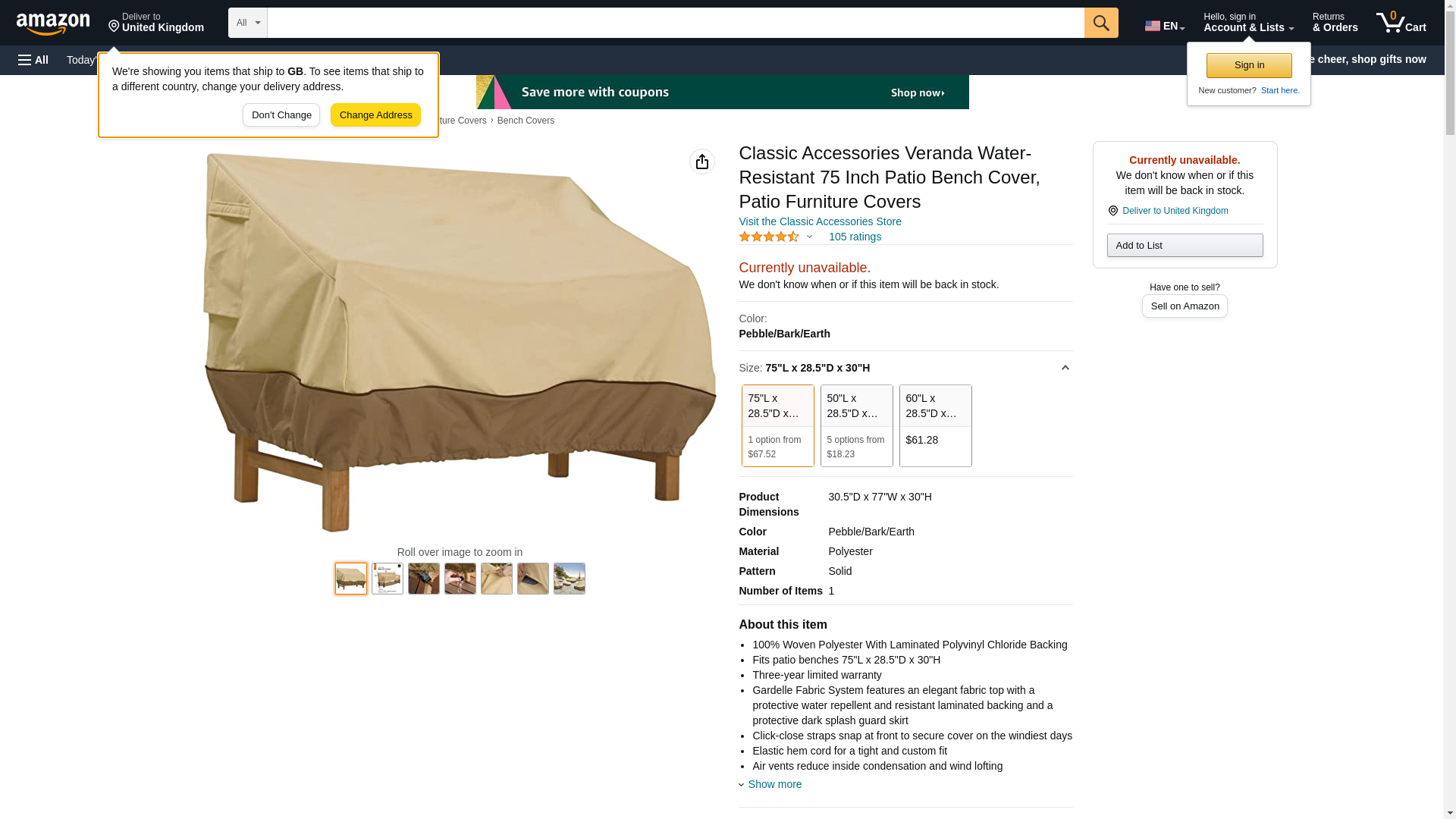 | Feature | THE CLASSIC ACCESSORIES DIFFERENCE: CA Veranda covers\xa0have\xa0interior bound seams for strength, high-density stitching for durability, padded handles for comfort, matching webbing for a great look and California Prop 65 compliance for\xa0health and\xa0safety |