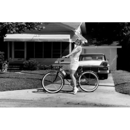 Stretched Canvas Art - Young woman sitting on bicycle in driveway - Large 24 x 36 inch Wall Art Decor Size.