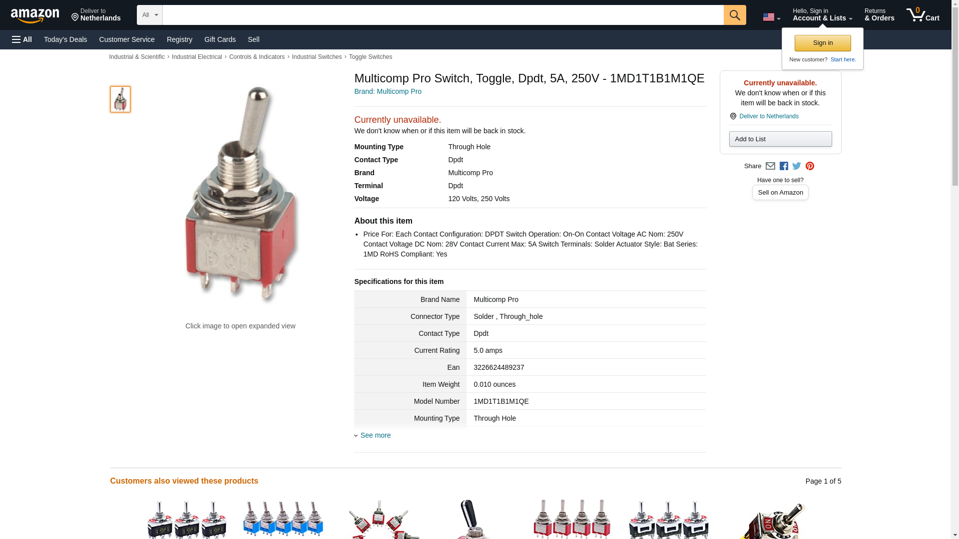 | Feature | Price For: Each Contact Configuration: DPDT Switch Operation: On-On Contact Voltage AC Nom: 250V Contact Voltage DC Nom: 28V Contact Current Max: 5A Switch Terminals: Solder Actuator Style: Bat Series: 1MD RoHS Compliant: Yes |