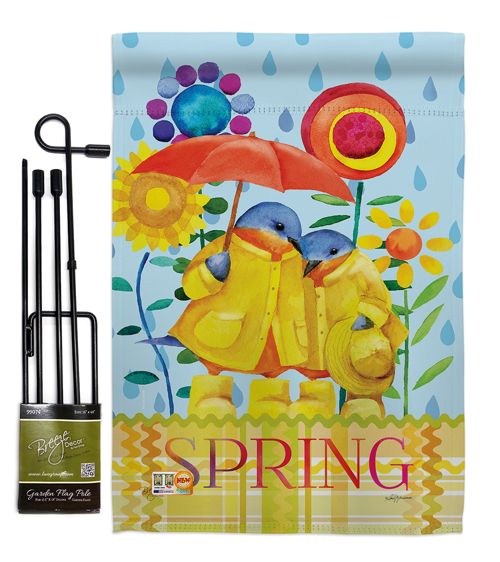 Birds Beautiful Mini Garden Flag with Metal Garden Banner Pole Stand Complete Set Breeze Decor have variety of Garden Flag Set for all occasions Uniquely design for hanging indoor or outdoor use We are committed to offering you exceptional values Our customers enjoy displaying our Garden Flag Set for longer periods For more than a decade weve been dedicated to manufacturing flags with no comparison in quality and beautiful designs Our flags are made with our Pro Guard material that is soft to the touch and designs can be read correctly on the flag A feature that our customers will love We are committed to using ecofriendly inks that wont leave a foot print in our environment Features. Rainy Day Bluebirds Garden Friends Birds Impressions Decorative Vertical Double Sided Flag Set with Banner Pole. Printed in USAInclude. 1 piece x Mini Garden Flag 13 x 185. 1 piece x 40 4 Pieces Breaks Down Metal Yard Banner StandSpecifications. Theme Birds. Garden Flag Size Garden Flag Set 13 x 185. Breaks Down Garden Flag Pole Size Breaks Down Garden Flag Pole 16 x 40. Print DoubleSided. Readable Readable Both Sides. Material Weather Resistant 3 Layers Blockout. Stitching Double Stitched. Display Vertical. Hang Type Sleeve. Artist Barb Tortillotte. Weight 109 lbs