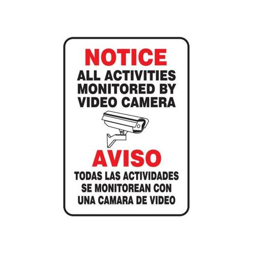 Accuform SBMASE813VP Plastic Spanish Bilingual Sign, "NOTICE ALL ACTIVITIES MONITORED BY VIDEO CAMERA/AVISO TODAS LAS ACTIVIDADES SE MONITOREAN CON UNA CAMARA DE VIDEO" with Graphic, 10" Length x 7" Width x 0.055" Thickness, Red/Black on White