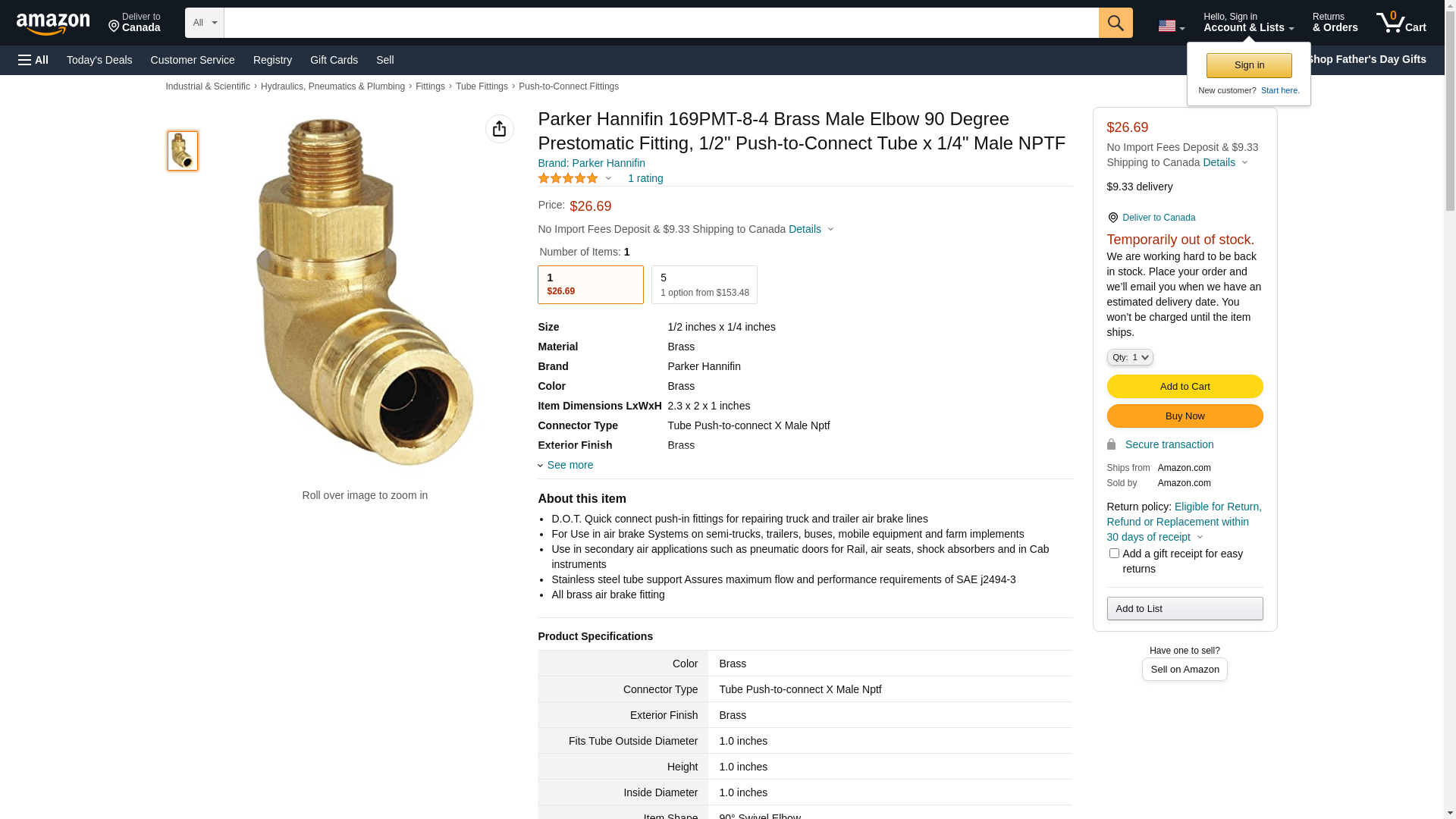 Parker Hannifin 169PMT-8-4 Brass Male Elbow 90 Degree Prestomatic Fitting, 1/2" Push-to-Connect Tube x 1/4" Male NPTF