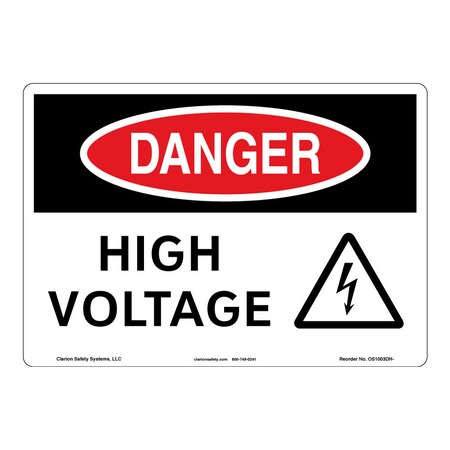 <p><strong>Word Message: </strong><br />HIGH VOLTAGE</p> <p><strong>Description: </strong><br />Clarion Safety Systems brings you Danger High Voltage safety signs (ITEM# OS1003DH-) which are produced on premium plastic or aluminum material and are designed to meet your OSHA sign needs.<p><strong>Material Information:</strong></p> <ul> <li><strong>Material</strong>: (BE) Indoor/Outdoor Aluminum</li> <li><strong>Base Materials</strong>: .040" Rigid White Aluminum</li> <li><strong>Overlaminate</strong>: none</li> <li><strong>Mounting Option</strong>: Mounting holes</li> <li><strong>Application</strong>: Indoor/Outdoor</li> <li><strong>MaxTemp</strong> (F): 175</li> <li><strong>MinTemp</strong> (F): -40</li> <li><strong>Chemical Resistance</strong>: Good</li> <li><strong>UV Resistance</strong>: Good</li> <li><strong>Outdoor durability</strong>: Good</li> <li><strong>Storage Stability</strong>: Stable. Optimum storage conditions: 72 F @ 50% relative humidity</li> <li><strong>Expected Life Indoor</strong>: Long term</li> <li><strong>Expected Life Outdoor</strong>: 3-5 year (expected outdoor life may vary due to climatic conditions)</li> <li><strong>RoHS</strong>: Yes</li> <li><strong>CRoHS</strong>: Yes</li> <li><strong>REACH</strong>: No</li> </ul>
