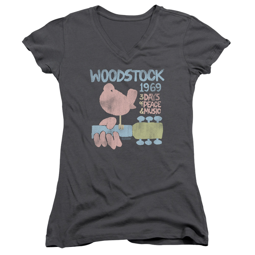 Trevco WOOD156-JV-4 Woodstock 50 Years Dove Print Juniors Sheer Cap Sleeve V-Neck T-Shirt, Charcoal - Extra Large