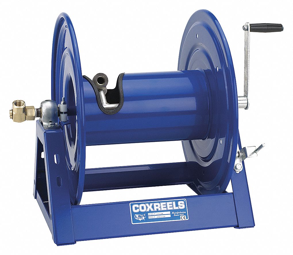 | Feature | Price For: Each Finish: Powder Coated Hose Included: No Housing Material: Steel Item: Hand Crank Hose Reel Drive Type: Hand Max. Pressure Rating: 3000 psi Bearings: Permanently Lubricated Color: Blue Mounting: Floor, Wall, Bench, Truck Swivel Material: Brass |