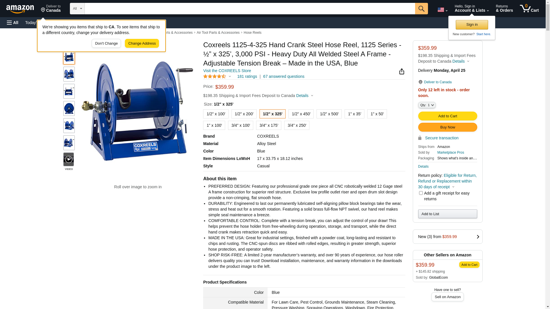 Coxreels 1125-4-325, Hand Crank Hose Reel: 1/2"x325' Hose Capacity, 3000 PSI (Hose Not Included)