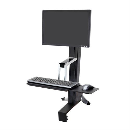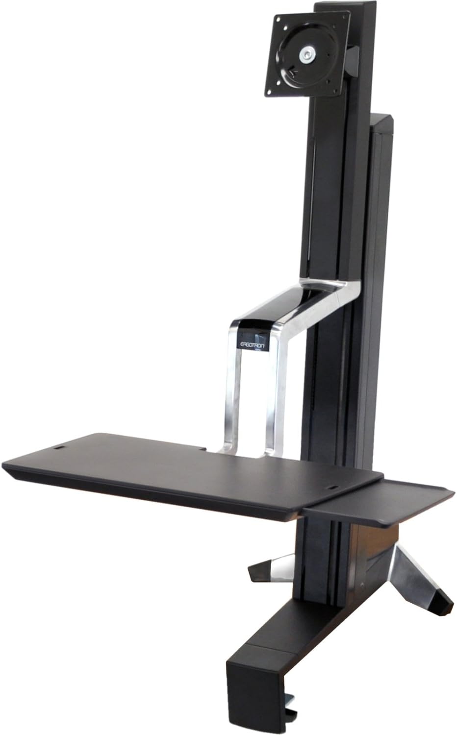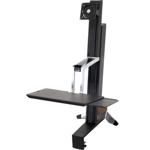 Promotes proper ergonomic positioning and inspires an on demand sit-stand work routine. Easily and simultaneously lift LCD screens to proper height for unsurpassed ergonomic comfort. Ergonomic back-tilt keyboard tray with left or right mouse tray ensures wrists remain in a neutral position during data entry, helping you avoid repetitive-stress injuries while increasing comfort and productivity. The unit offers base height adjustment and individual display adjustment. Counterbalanced adjustment points allow instantaneous, tool-free re-positioning while you work. Modify existing office spaces or cubes by simply clamping a WorkFit-S on an existing worksurface, without the cost of expensive professional installers. Simply clamps onto existing worksurface 2/5" to 2 2/5" thick. Holds one LCD LD monitor up to 24". Color: Polished Aluminum/Black; Height Maximum: 29 1/2"; Weight Capacity (text): 25 lbs.; Lift: 18".