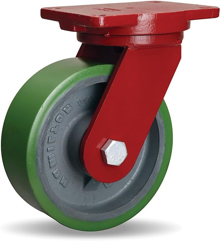 HAMILTON Extra Heavy-Duty Casters feature precision integrated HPI swivel technology that improves the bearings element of contact and more than doubles the number of contact points.-1/2" thick drop forged steel mounting plate. -3/8x3" plate steel legs are welded inside and outside to forged steel horn base. Sturdy 1" diameter integrally forged kingpin with mounting plate. Main HPI load bearing is 5-5/16" outside diameter with hardened raceways to 58-62HRC and ground to surface finish 16 micro inches; secondary load bearing has 1" precision tapered thrust bearing that counteracts radial thrust. -3/4" diameter axle. Ball check type lubrication fittings in swivel assembly and wheel hubs.