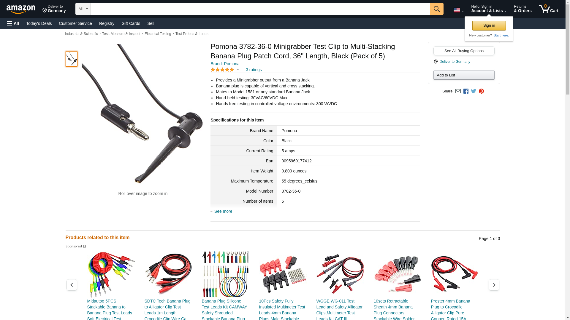 - POMONA TEST CLIP TO STACKING BANANA CORDS, POWER RATING: 3000 WVDC, CURRENT RATING: 5 A, WIRE