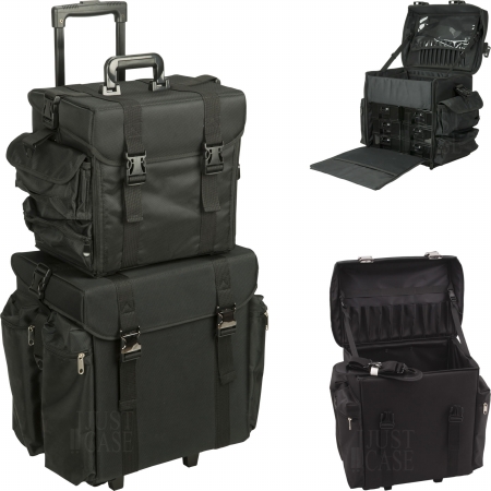 Justcase T5172NLAB 2 in 1 All Black Nylon Soft Sided Professional Rolling Makeup Hairstylist Case with Drawers & Sid