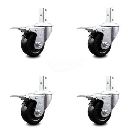 Swivel Square Stem Caster Set 4 w/3.5” x 1.25” Black Hard Rubber Wheel-3/4” x 2” Square Stem with (3) 17/64” Diameter Mounting Hole-Include 4 Total Lck Brakes-1140lbs. Cpty/Caster-Service Caster Brand