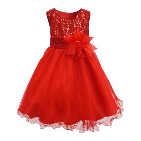 <ul> <li>Bring out a lovely pop of color and add more intensity and charm to the season with this red dress</li> <li>Gown is adorned with a flower and sash at the waist</li> <li>Sprinkled with glittery sequins on the bodice and has an overlaid skirt with fancy wire hem</li> <li>Fabric and care: 100% polyester. Hand wash, hang dry</li> <li>Sizing is based on U.S. clothing size standards</li> </ul>