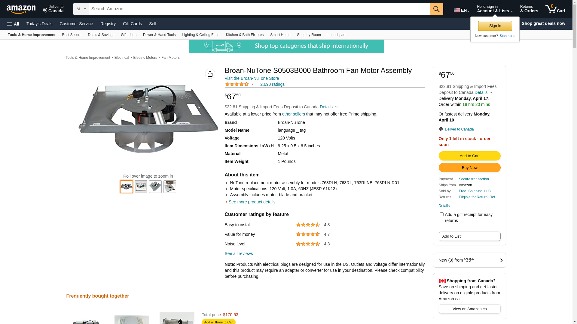 | Feature | NuTone replacement motor assembly for models:763RLN, 763RL, 763RLNB, 763RLN-R01 |