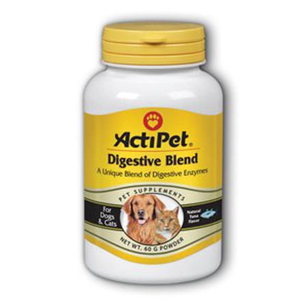 <br /> <font><b>Description </b></font> <font>ActiPet Digestive Blend contains prebiotics to nourish beneficial bacteria, along with enzymes essential to the digestion and assimilation of proteins, fats & carbohydrates. </font> <p><font></font> <br /> <font><b>Size </b> </font> <font>60g Powder </font> <br /> <font><b>Directions </b></font> <font>For Cats 1-15 lbs. 1/8 teaspoon w/ meals; 16-30 lbs. 1/4 teaspoon w/ meals. For Dogs 1-15 lbs. 1/4 teaspoon w/ meals; 16-30 lbs. 1/2 teaspoon w/ meals; 31-70 lbs. 3/4 teaspoon w/ meals; over 70 lbs. 1 teaspoon w/ meals. </font></p> <p> <br /> <font><b>Serving Size </b></font> <font>1 Powder </font> <br /> <br /> <br /> <font><b>Ingredients </b></font> <font><b>Amount per serving </b></font> <font><b>% Daily Value </b></font> <br /> <font>Parsley Petroselinum crispum aerial </font> <font>25 mg </font> <font> </font> <br /> <font>Ginger Zingiber officinale root extract 5 1 </font> <font>25 mg </font> <font> </font> <br /> <font>Peppermint Mentha X piperita aerial </font> <font>50 mg </font> <font> </font> <br /> <font>Papain from Papaya </font> <font>50 mg </font> <font> </font> <br /> <font>FOS Fructooligosaccharides </font> <font>50 mg </font> <font> </font> <br /> <font>Chamomile Matricaria recutita flowering tops </font> <font>50 mg </font> <font> </font> <br /> <font>Bromelain from Pineapple stem </font> <font>50 mg </font> <font> </font> <br /> <font>Digestive Enzyme Blend Amylase, Glucoamylase, Protease, Alpha Galactosidase, Cellulase, Bromelain, Papain, Lactase, Lipase, Pectinase with Phytase, Invertase </font> <font>75 mg </font> <font> </font> <br /> <font><b>Key to Ingredients </b><br /> = Daily Value not established. <br /> = Percent Daily Value is based on a 2,000 calorie diet. <br /> = Values differ depending on age<br /> = Values differ depending on age </font> <br /> <font><b>Other Ingredients </b></font> <font>Natural Tuna Flavor, Rice Flour and Maltodextrin </font></p> <p> <br /> <font><b>Other </b></font> <font>See product label for more information. </font> <br /></p>