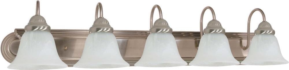 60-323, nuvo, ballerina, 5, light, 36", vanity, alabaster, glass, bell, shades, Product Description: Ballerina 5 Light 36" Vanity With Alabaster Glass Bell Shades. Product Collection: Ballerina. Lighting Category: Bathroom Wall & Vanity Fixture. Style: Traditional. Finish: Brushed Nickel. Shade: Alabaster. Dimensions: 7.625" Height x 36" Width x 8.5" Extension. Bulbs: (5) 100 Watt A19. Bulbs Not Included. Suitable for Damp locations.