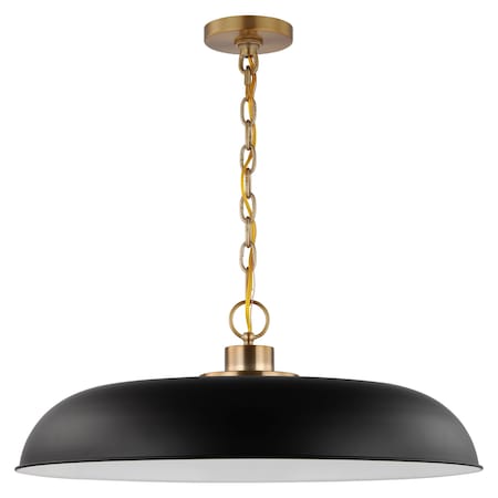 Designed with neutral, clean lines, the Colony 60-7487 large hanging pendant is ideal for an eat-in kitchen, dining room, and even a bedroom. The loft-style shallow pan metal shade is done in matte black with a white interior to reflect the downfacing lamp. The burnished brass finish on the base, chain, and canopy adds an elegant touch to this flexible design.