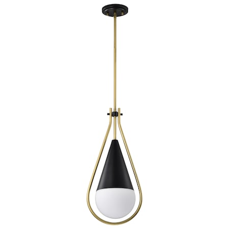 A modern collection with a twist, the Admiral 60-7902 small pendant features a dual finish, unique design, and a fashionable statement for home luminaires. A suspended tear-dropped shape is comprised of matte black with natural brass elements encompassing the fixture. The white opal glass orb shields the light source for smooth, even lighting to bring a warm glow to any space. A beautiful design that is versatile and will compliment a variety of home decors. Accepts one 60 watt A19 medium base bulb or LED equivalent / Steel Construction / White Opal Glass / Matte Black Finish / Damp Location Rated / 1 Year Warranty / Instructions and mounting hardware included for easy installation / Experience the perfect blend of style and functionality with the Admiral collection, tailored to suit your unique taste and elevate your living spaces..