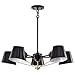 The Baxter 60-7385 five-light chandelier does not disappoint with its modern design and impressionable style. The black shades are finely cut at an angle and feature a white interior to maximize the light output. The lustrous burnished brass stems attach from the lamps to the center of the fixture, beautifully mimicking the angles of the shades. This excellent fixture will bring years of beautiful and timeless lighting to your home. Uses five 60-watt incandescent medium base bulbs Fixture measures 28 inch length x 28 inch width x 7 inch height Rated for indoor use in dry locations Finished in black with burnished brass accents and matching metal shades Mounting hardware and installation instructions included Limited one year fixture warranty. Canopy Included: Yes / Canopy Diameter: 4.75 / Sloped Ceiling Adaptable: Yes / Rod Length(s): 36.00 / Shade Included: Yes / Shade Dimensions: 7.25 x 4.75.