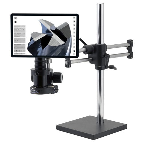The TKSS-LV2 Super-Scope HD Integrated Video Inspection System with 5MP Hybrid HDMI/USB Camera, Integrated 12" LCD Monitor, Double Ball Bearing Base, and LED Ring Light stands heads and shoulders above its competition, boasting features found on much more expensive equipment. Its freestanding design allows for use anywhere on the manufacturing floor, without any need for a PC.|The heart of the O.C. White TKSS-LV2 Super-Scope is the 5MP Hybrid HDMI/USB camera with a 12 inch integrated LCD screen. Featuring full 1080 resolution (300dpi) for super detailed viewing, the camera also includes onboard tools, such as image and video capture, calibrated measurement, split screen live view, and more. Unlike microscopes with restrictive eyepieces, the TKSS-LV2 Super Scope offers 'heads up' viewing for greatly reduced eyestrain, neck fatigue, and improved posture.|The TKSS-LV2 system features exclusive varifocal lens technology, which allows for up to 80x magnification (with optional accessories) and working distances that can be measured in feet, not inches. The large working distance range means that any height operator can readjust to fit them easily; EH&S personnel in particular can see immediate benefit.|The TKSS-LV2 is supplied with a durable 24" tall double ball bearing base. It also includes the model LV2000 High Intensity 5700K LED Ring Illuminator, which is equipped with a 9 LED surface mount array and exclusive thermal management system. The LV2000 LED Illuminator is the brightest on the market and even rivals 150W halogen illuminators. The LV2000 has a total energy consumption of only 8W and also features a 100-240V (50/60Hz) auto switchable transformer design. Its ESD safe construction contains surface mounted LED technology that provides dimmable 5700K light with no hotspots, low power consumption, "instant-on" startup and zero desktop footprint.