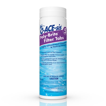 Poly-brite filter tabs are not your average clarifier. Compatible with sand, diatomaceous earth and cartridge filter systems. Permits filter to remove organic and inorganic impurities providing polished water clarity. Works in as little as 12 hours and leaves no floc to be vacuumed. Can be applied through the skimmer, gutter, pump pot, surge pit or off-line feeder. Reduces amount of sanitizer consumed by physically removing organic and inorganic material.1.5 pounds of poly-britetm will provide up to 5 treatments on a 30,000 gallon pool or 1 treatment on a 150,000 gallon pool.; ; Brand Name: O-ACE-sis Product Form: Tablet Product Type: Clarifier Product Group: Specialty Container Size: 1.5 lb