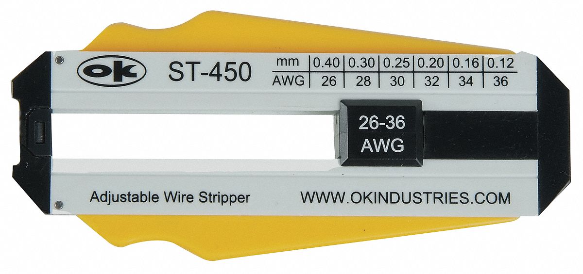As an Amazon Associate, we earn from qualifying purchases. ADJUSTABLE WIRE STRIPPER,26-36AWG OK INDUSTRIES . 5TDD3 Gallery Attributes Brand name, Manufacturer name, ManufacturerOK INDUSTRIES Attribute00Adjustable Wire Stripper Attribute01RG-59/6, RG-6 Attribute02Electrical Wire Strippers Attribute0336 to 26 AWG Attribute04, Attribute22No Attribute05Stripping Attribute06Plastic Attribute07Standard Cushion Attribute0826 ga Attribute093 7/8 in Attribute100.08 lb Attribute11, Attribute2426 AWG Attribute12, Attribute2336 AWG Attribute13, Attribute1426 AWG, 28 AWG, 30 AWG, 32 AWG, 34 AWG, 36 AWG Attribute15Solid Wire Attribute16Standard Attribute17None Attribute18Steel Attribute19Built-in Adjustment Dial Attribute202 in Attribute2136 ga AttributeKey00Item AttributeKey01Stripping Capacity- Cable AttributeKey02Type AttributeKey03Cutting Capacities AttributeKey04Insulated AttributeKey05Application AttributeKey06Body Material AttributeKey07Grip Style AttributeKey08Maximum Wire/Cable Diameter AttributeKey09, length_AttribOverall Length AttributeKey10Weight AttributeKey11Maximum Stripping Capacity - Solid Wire AttributeKey12Minimum Stripping Capacity - Stranded Wire AttributeKey13Stripping Capacity - Solid Wire AttributeKey14Stripping Capacity- Stranded Wire AttributeKey15For Wire/Cable Type AttributeKey16Handle Style AttributeKey17Adjustment Mechanism AttributeKey18Blade Material AttributeKey19Features AttributeKey20Maximum Strip Length AttributeKey21Minimum Wire/Cable Diameter AttributeKey22Tether Ready AttributeKey23Minimum Stripping Capacity - Solid Wire AttributeKey24Maximum Stripping Capacity - Stranded Wire DimensionUnitinch Extra Product NameADJUSTABLE WIRE STRIPPER,26-36AWG UNSPSC27111510 Weight0.1 WeightUnitlbs length3.875 moq, multiple, tierMinQty11 MPN5TDD3 originalCurrency{'currency': 'CAD', 'tierPrice1': '103.21'} qtyInStock0 SKUWWG5TDD3 tierPrice174.91043726 Distributor offers SellerSKUMOQIn stockMultiplePrices grainger.caWWG5TDD3111 @ $74.91