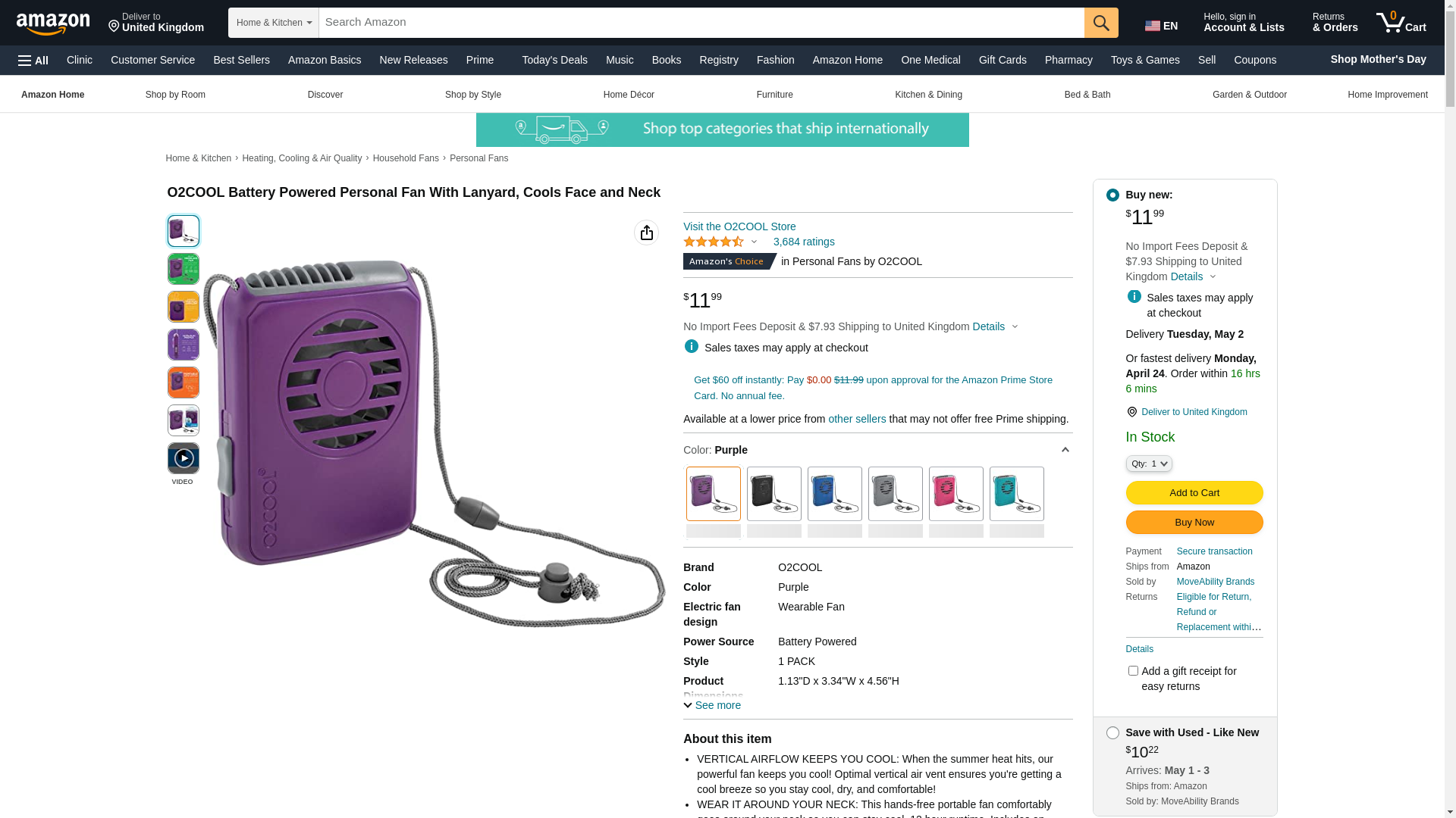 O2COOL Deluxe Necklace Fan, Purple