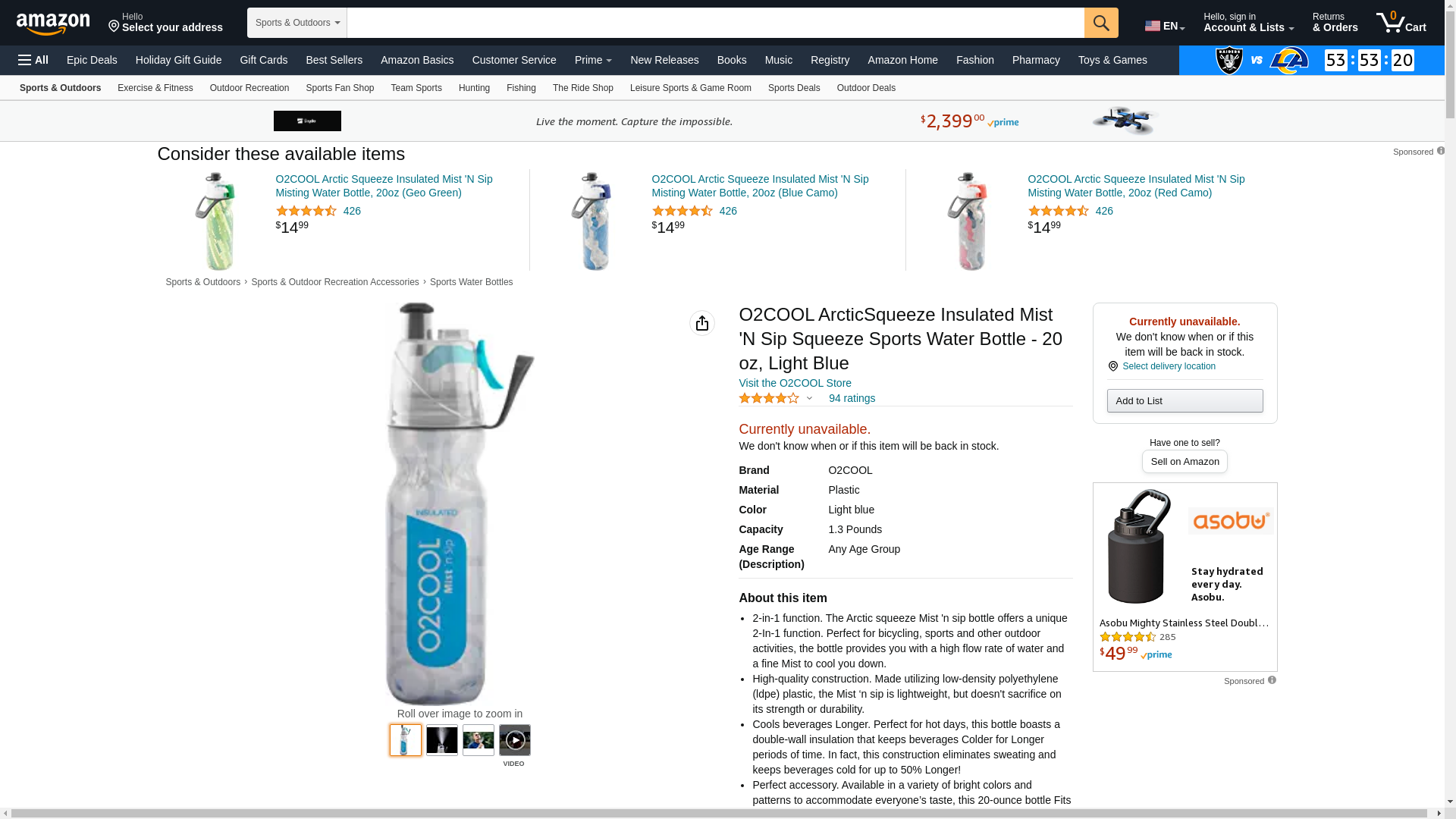 O2COOL ArcticSqueeze Insulated Mist 'N Sip Squeeze Bottle 20 oz., Blue