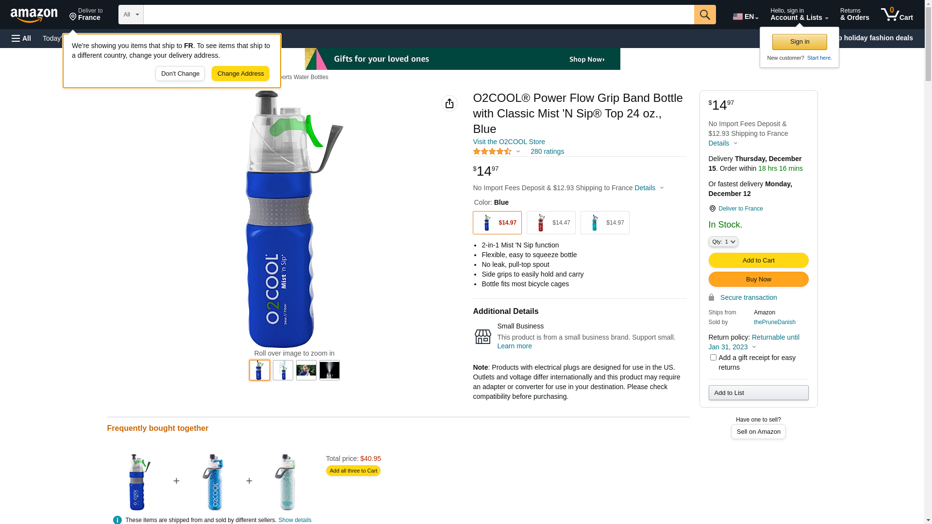 O2COOL Power Flow Grip Band Bottle with Classic Mist 'N Sip Top 24 oz., Blue