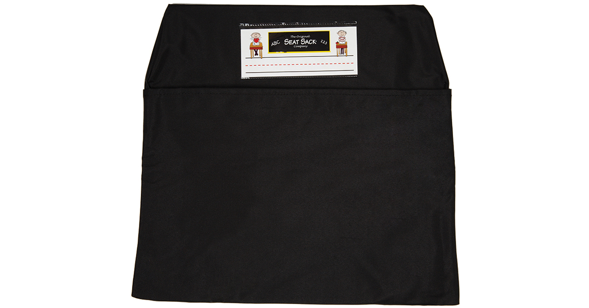 SEAT SACK MEDIUM 15 IN BLACK - Just slip over the back of any hair; the integrated pocket holds all kinds of items. Made of sturdy laminated flame-retardant fabric. Easy to clean.<br />Medium Square. Fits up to a 15" wide or square wooden chair.<br />Actual product color is: BLACK