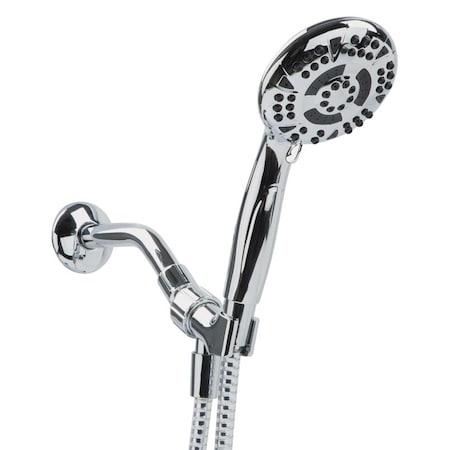 This 5 function handheld shower includes a 60 hose and a shower arm mount. It features a stylish plated face and rub clean nozzles that allow for easy cleaning. It is Watersense certified with a water saving 1.8 gpm flow rate that doesn't comprise your