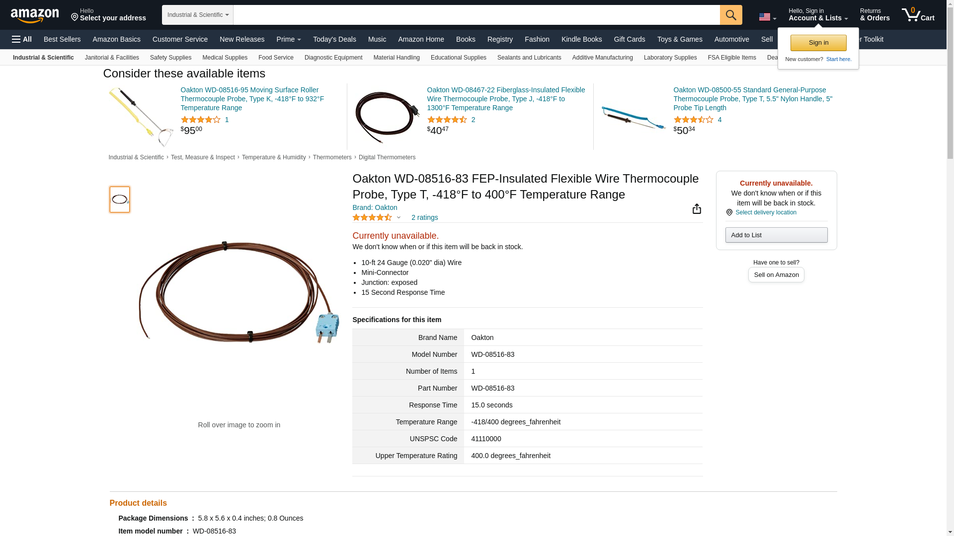 Oakton WD-08516-83 Teflon FEP-Insulated Flexible Wire Thermocouple Probe, Type T, -418°F to 400°F Temperature Range. ...