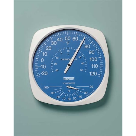 Analog Hygrometer, Scale Type Dial, -22 Degrees to 122 Degrees F/-30 Degrees to 50 Degrees C, Primary Scale Humidity, Dial Design White Scale on Blue Dial, Graduations 2 Degrees F/5 Percent RH, Humidity Range 25 Percent to 80 Percent, Wall-Mount, 10 3/4 in dia