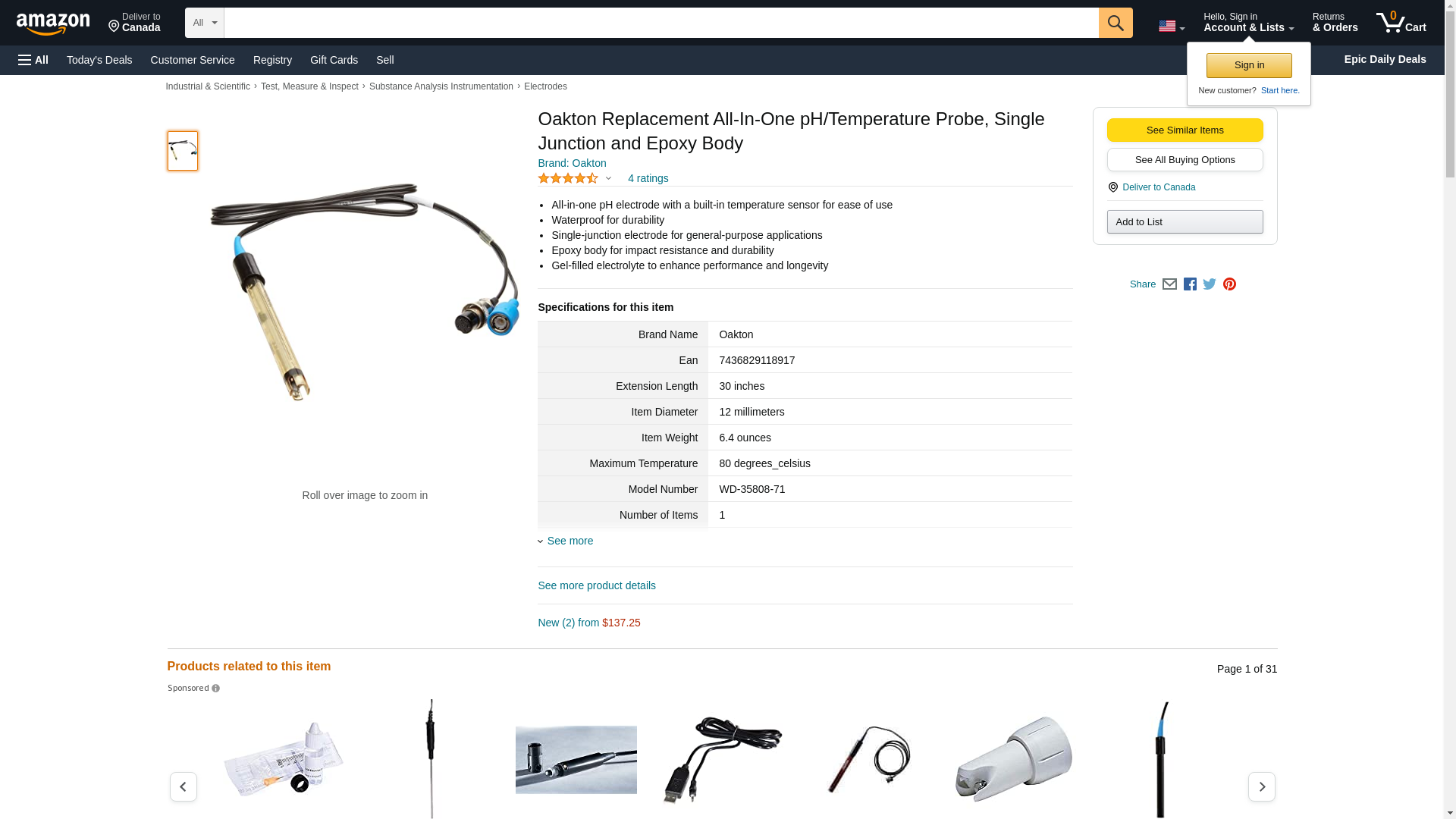 Oakton, WD-35808-71, Single-Junction pH Electrode, Waterproof Type Connect These economical electrodes are ideal for field, clean water, and general-purpose applications. They feature a rugged epoxy housing. Pin-type junction provides low electrolyte flow for long life. Features Single-junction Epoxy-body Gel-filled Standard range of 0 to 12 pH Use electrode fits for: pH 300/310, pH/CON 300, pH/CON 510 models.