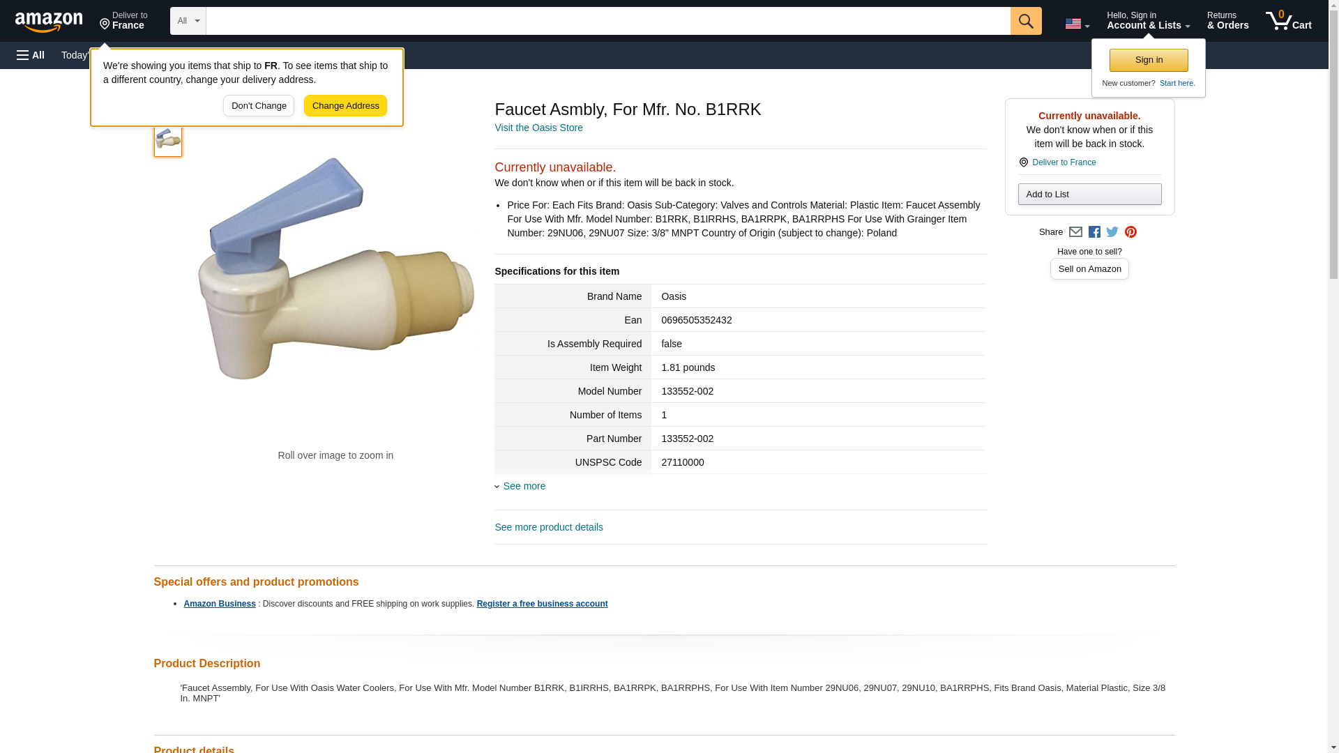 - <b>Price For:</b> Each <b>Fits Brand</b>: Oasis <b>Sub-Category</b>: Valves and Controls <b>Material</b>: Plastic <b>Item</b>: Faucet Assembly <b>For Use With Mfr. Model Number</b>: B1RRK, B1IRRHS, BA1RRPK, BA1RRPHS <b>For Use With Grainger Item Number</b>: 29NU06, 29NU07 <b>Size</b>: 3/8" MNPT <b>Country of Origin (subject to change)</b>: Poland