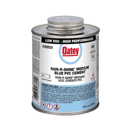 Oatey PVC Rain-R-Shine Medium Bodied Fast Set Blue Cement is recommended for pool and spa, irrigation, potable water, pressure pipe and DWV applications. It is formulated for wet conditions and quick pressurization, and is easy to apply with included in-lid dauber. This blue, medium bodied, fast set cement can be used to solvent weld all schedules and classes of PVC pipe and fittings up to 6 in. diameter with interference fit. Oatey products have earned the trust of plumbing professionals for over 100 years; ; Brand Name: Oatey Sub Brand: Rain-R-Shine Color: Blue Product Type: Cement Pipe Material or Type: PVC Container Size: 16 oz Maximum Temperature: 110 �F Maximum Pipe Diameter: 6 in. Minimum Temperature: 40 �F VOC Level: 425 g/L Applicator in Lid: Yes Set Speed: Fast Set Maximum Use Temperature: 140 deg. F Weight: 1.16 lb.