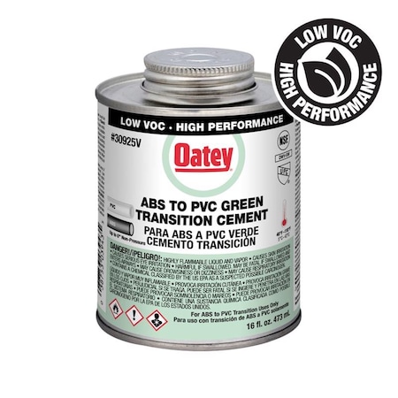 Oatey ABS to PVC Transition Medium Bodied Green Cement is recommended for DWV-sewer applications. The green color easily identifies application to pipe surface. Its medium body has excellent gap filling properties and is easy to apply with included in-lid dauber. This fast set cement can be used to join ABS to PVC in non-pressure transition joints up to 6 in. diameter. Oatey products have earned the trust of plumbing professionals for over 100 years.; ; Brand Name: Oatey Color: Green Product Type: Transition Cement Pipe Material or Type: ABS/PVC Container Size: 16 oz Maximum Temperature: 110 �F Maximum Pipe Diameter: 6 in. Minimum Temperature: 40 �F VOC Level: 510 g/L Applicator in Lid: Yes Maximum Use Temperature: 140 deg. F Weight: 1.16 lb. Set Speed: Fast Set