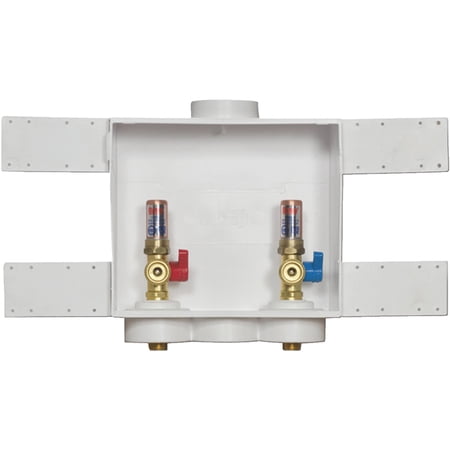 Oatey Quadtro washing machine outlet boxes can be used in commercial or residential applications which require supply valves and waste drain recessed into the wall. Available water hammer arrestor option provides water pressure shock arrestors required for installation on supply lines to quick closing valves. Fits PVC or ABS Sch. 40 DWV pipe.