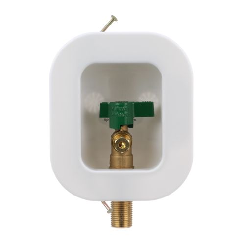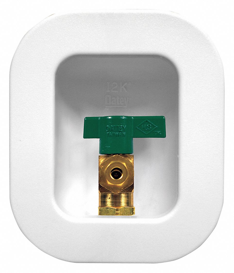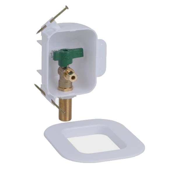 Outlet Box, Ice Maker, Inlet Connection Copper Sweat, Box Width 3.3 In., Box Height 4.5 In., Box Depth 2.4 In., Faceplate Width 5 In., Faceplate Height 6 In., Drain Location No Drain, Valve Connection Copper Sweat, Material of Construction Polystyrene Box, Low Lead Alloy Valves, Duplex Receptacle None