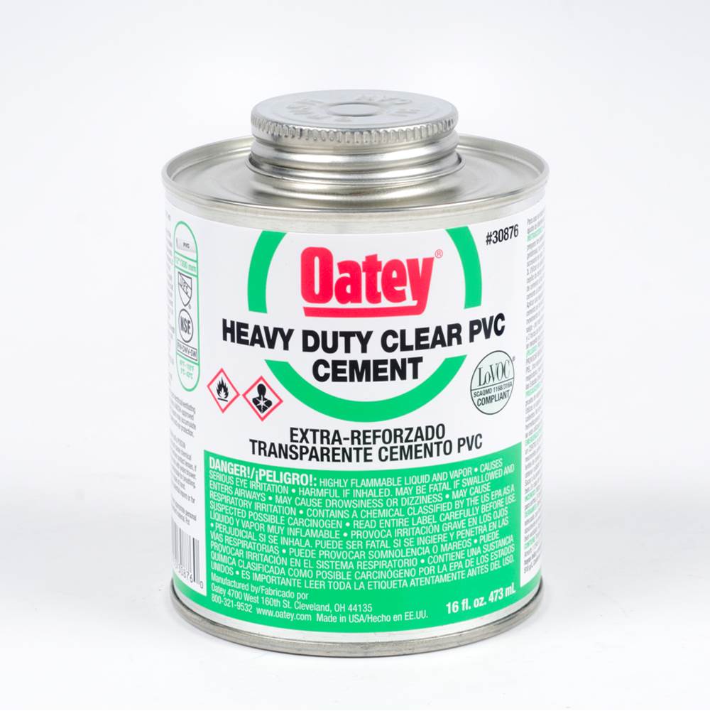 Oatey Heavy Duty Clear PVC Cement is formulated for use on all schedules and classes PVC pipe and fitting up to 12" diameter with interference fit, up to 18" for non-pressure.