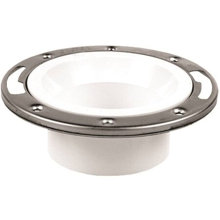 Closet flange with corrosion resistant stainless steel ring without test cap. Fits over 4" schedule 40 DWV pipe. Adjustable ring for alignment of bolts and screws, sits flush on floor.