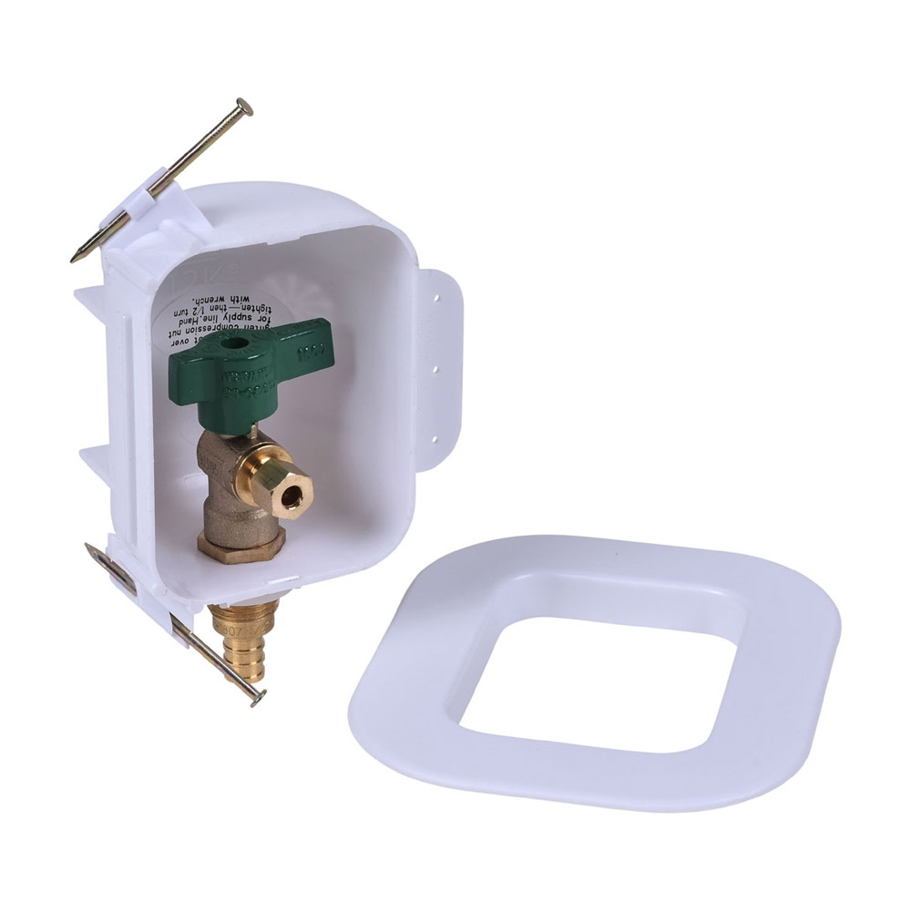 Oatey, 39136, I2K 1/4" F1807 Low Lead Ice Maker Outlet Box w/o Hammer, Standard Pack Features: Nails preloaded. Right or left hand installation. Provides quick, safe water supply and shut-off for refrigerator ice maker and water dispenser. Valves comply with requirements of NSF 61, Section 9. No support bracket needed. Dimensions: Box: 3-1/4" W x 4" H x 2-1/2" D Faceplate: 5" W x 6" H